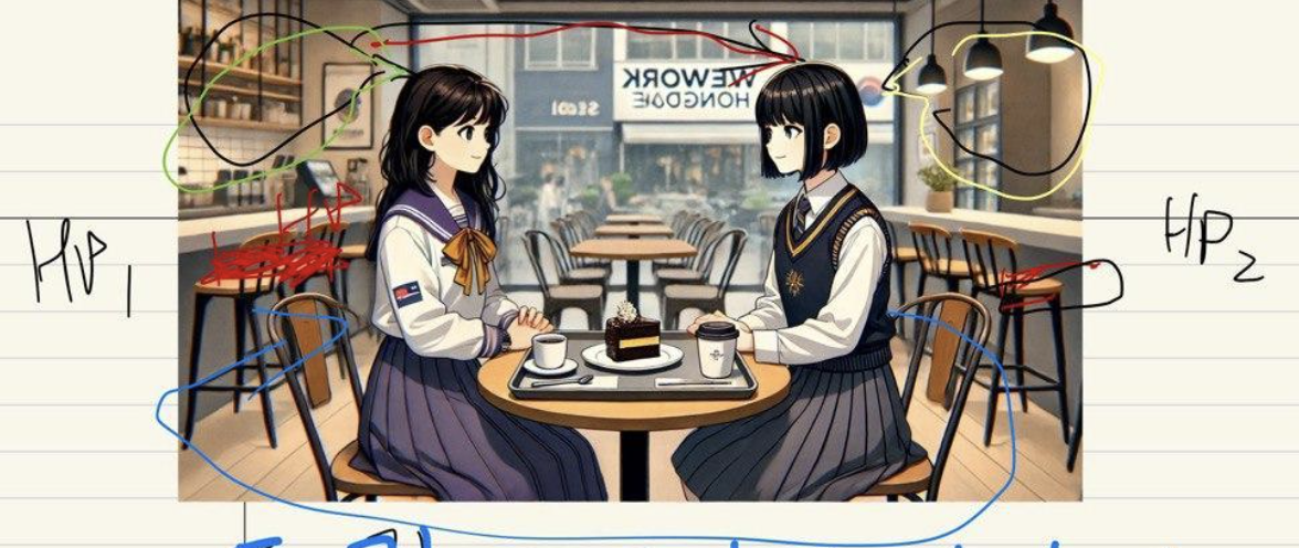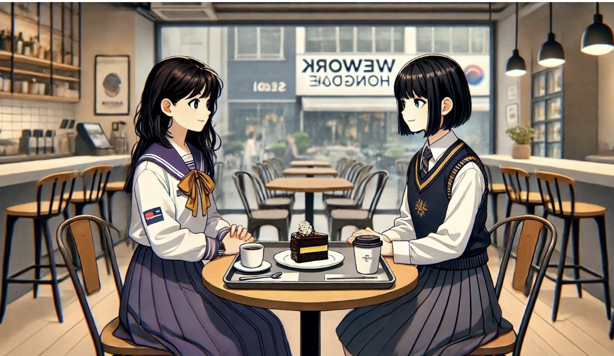 平和な午後のカフェ。テーブルの上にはたった一つの「ドバイ・チューイー・クッキーケーキ」が置かれています。向かい合って座る二人の女子高生は笑顔で会話していますが、その裏ではケーキを独り占めするための熾烈な心理戦が繰り広げられています。