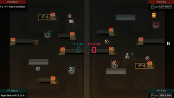 each Player has to control the characters in two screens simultaneously with one controlling and each can shoot the bullets and destroy one of competitor's robots. You can shot when you have bullets and use objects which are located in stages to against enemy. You can use the objects as a trap and can destroy the enemies, decoying the competitors' robots into the traps.